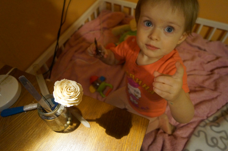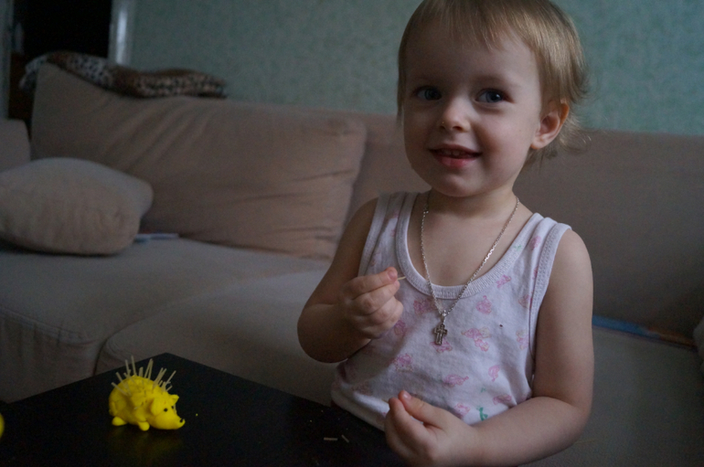Поля. Ну она у нас такая... ей на сегодня 2 года 8 месяцев 8 дней 4 часа. Рост 92 см, вес 12кг. Есть все зубы, волосы короткие, светло-русые, глаза - серо-синие, нос - острый, прямой. 2 уха, 1 разбитая губа, 1 нормальная, 2 руки и 2 ноги ни разу не сбитые (как можно прожить 2 года 8 месяцев 8 дней и 4 часа и не разбить локти и колени, скажите вы - а вот так, отвечу я вам! Это талант!). вот такой у меня одарённый ребенок. Что еще? да всё! Ест - всё. Пьет - тоже. Любимые лакомства - "молёзеное, сёколадки, кифинки (конфетки), мемеладик, сахаль, гусёнка, валения всякие..." - это цитата. Любимые напитки - "мемелялька - минералка, которой угощает дедушка, цяй и какао", хотя и соками-компотами не брезгуем.