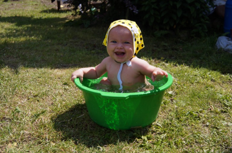 Вот он, мой родненький, внизу вылез правый резец. Его почти не видно, ямочка там малюсенькая и капельку торчит зубок. Такой остренький!!! Эх...) Купаемся во дворе.)))