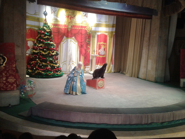 Примерно месяц назад здесь на ББ прчитала пост о посещении уголка Дурова и сразу "загорелась"... Сели мы в машину и поехали к началу утреннего представления в будний день (ну кто ходит (кто может себе это позволить???) по театрам в будни по утрам!!!) Оказалось, что ходят, и билетов в кассе нет уже до февраля 2013 года... Исключением были билеты на Елку "Новогодний каприз королевы" на 24 и 25 декабря и билеты на "Мышинную железную дорогу", про которую все отзывы на сайте театра как о редкостной фигне... Марина "огорчилась" до слез, так что я решила брать билеты на Елку...