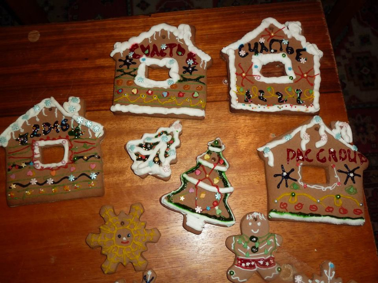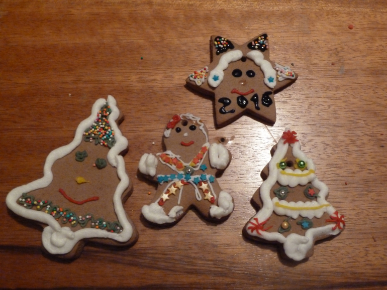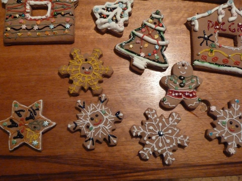 Вот что мы творили))) Наше творчество с Аней))) Мини-презенты друзьям и знакомым на Новый Год)) Разукрашивали имбирные пряники. Аня измазюкалась, я в поту. Только не спрашивайте, почему снежинки улыбаются, а человечек в красных трусах в звёздочку и рубашке в ёлочку. У нас всё волшебное)))) Как Аня хотела, так и рисовали. Точнее мама рисовала, а Аня разукрашивала себе руки, лицо, стол.
