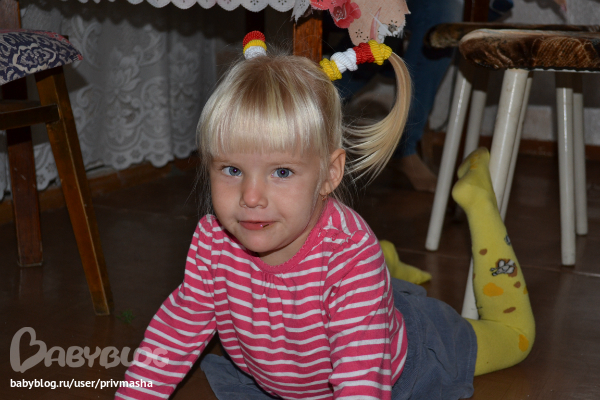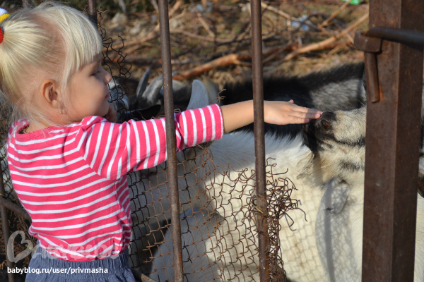 КирёнаПо дороге к одной из прабабушек,она живет в своем доме,на одном участке пасутся козы. Кира их так любит. Все время бежит к ним с криками "козочки мои любимые,как же я по вам скучала...." Варе они тоже нравились,пока они чуть не съели ее игрушку-свинюшку,теперь они не в почете у нее,обижена она на них)))) И вот мы последний раз кормили их травкой,и потом по приходу к прабабушке, Кира заявила,что она теперь тоже коза,накидала укроп на пол и будет теперь так есть)))))