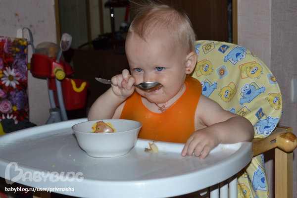 Едим мы практически все,кроме конечно же всяких вредностей. Но готовлю я на всю семью одно,ничего не мельчу. Сися у нас пока остается любимым блюдом. Ровно с дня рождения дочка начала есть сама ложкой,и теперь мы наверное будем худеть,т.к. кормить она себя категорически не дает,а сама доносит наверное меньше половины. Пьет в основном только воду,иногда сока немного выпьет. По ночам мы пока так же кушаем,но значительно меньше и реже. Пытаюсь водой заменить,она порой на бутылку даже губы сжимает...