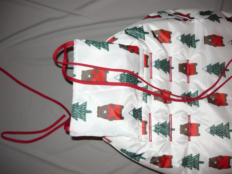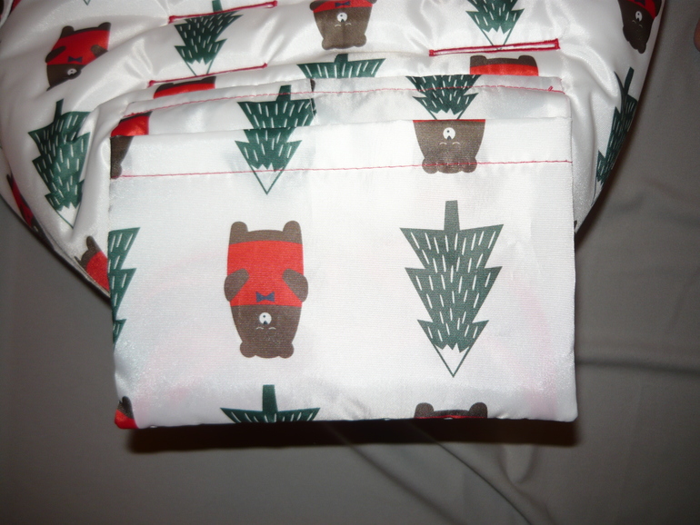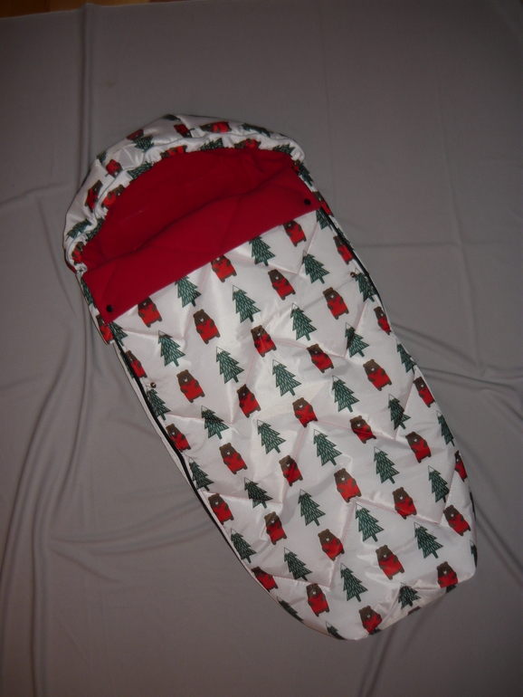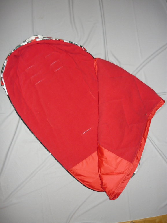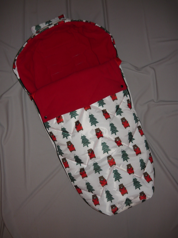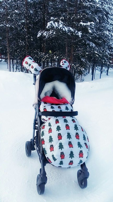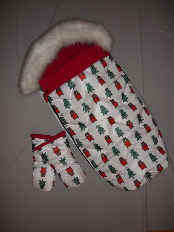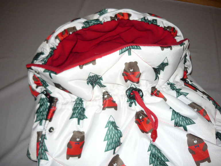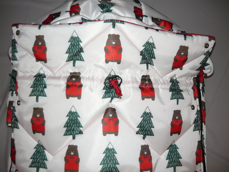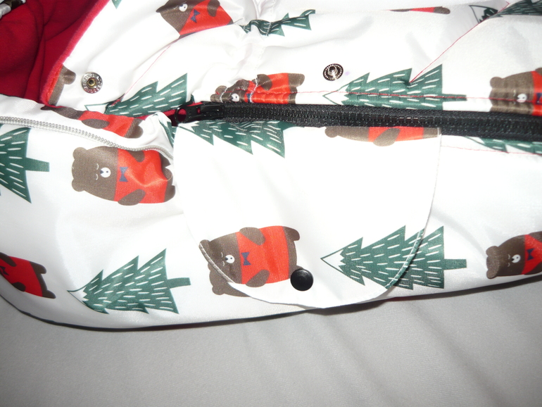 Ну и собственно сам конверт - 55*107, капюшон цельный, утяжка капюшона, утяжка накидки, защита от грязных ног, крепление к коляске, 2 двухзамковые молнии, опушка съемная, 2 ряда кнопок для фиксации отворота накидки. Стежка зиг-загом.