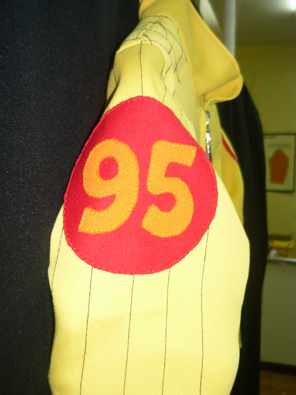на рукавах нашивки в стиле тачек - номер и значок молнии мак квина