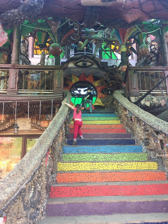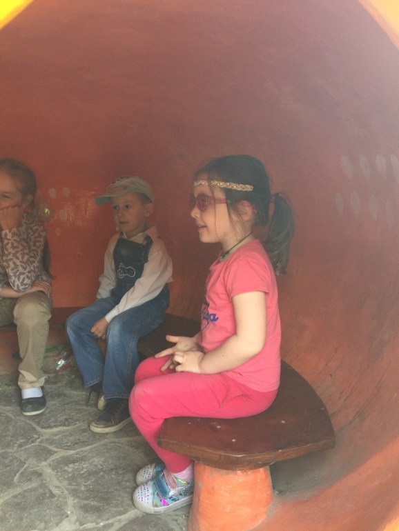 Она носилась там, поднималась по лестницам, скакала, восторгалась и вынесла вердикт: "давайте тут поживем", наш сердобольный папа уже было задумался-да что там-и я уже, окинув территорию взглядом, захотела заночевать тут, пошла узнавать про номера-в этом отеле их всего 6, но они стилизованы-выглядят просто потрясно, но и стоят.... за ночь в среднем 6 тыс, на такое мы были не готовы, правда за ним есть отель, в котором можно переночевать за 1500, но мы не готовились, поэтому решили все же в следующий раз приехать уже с ночевкой! Очень уж захотелось потусить в шикарном ресторанном комплексе с разными столиками и будочками