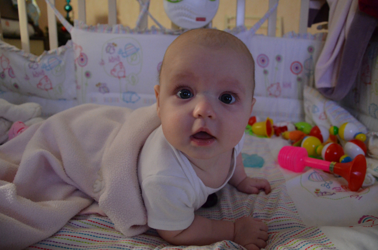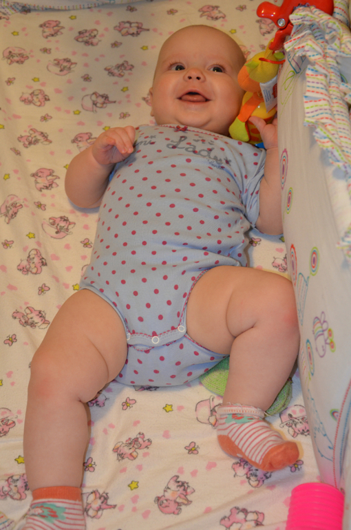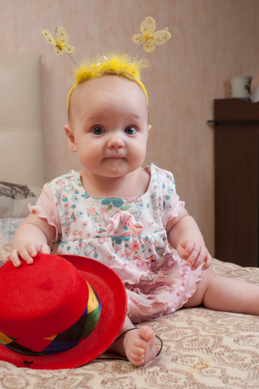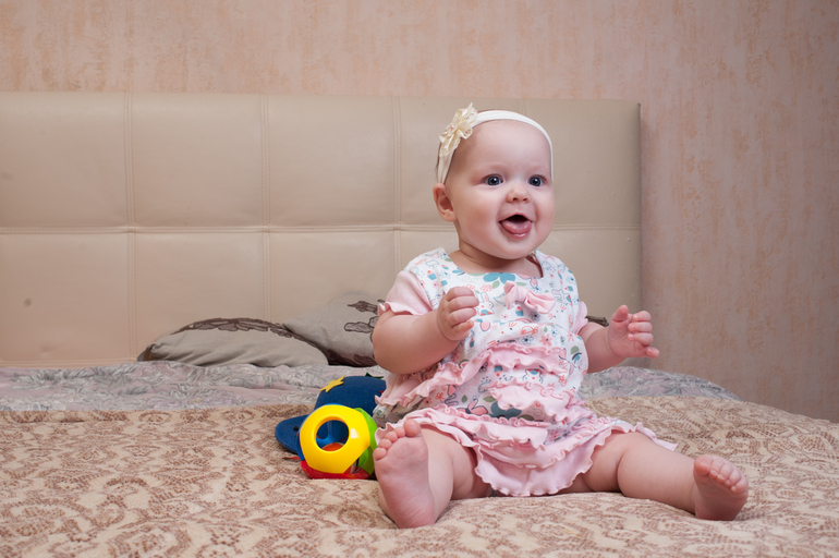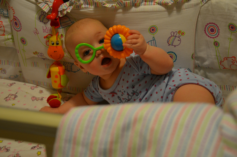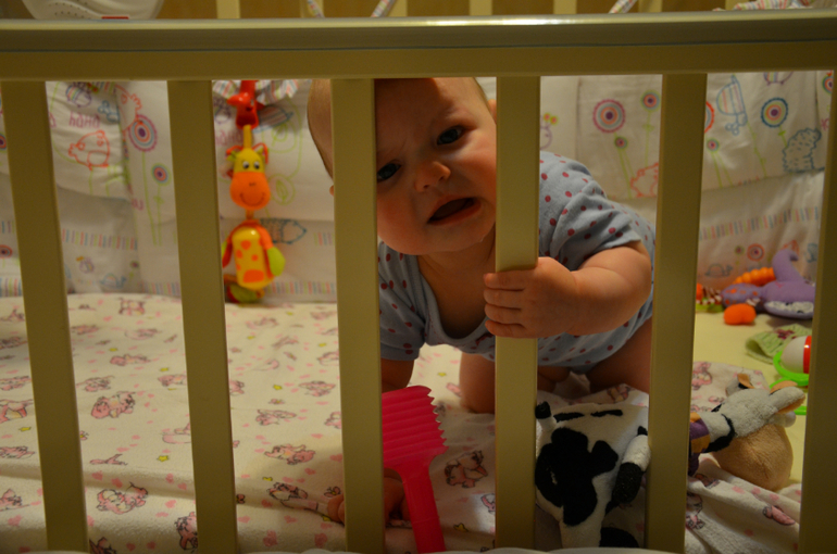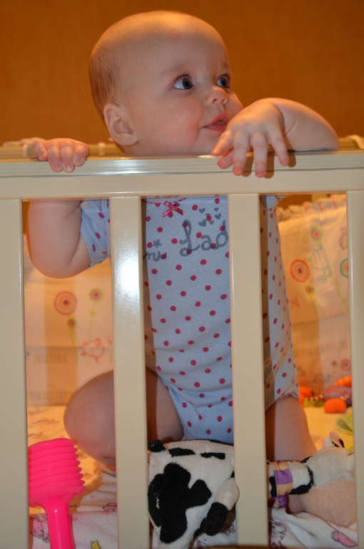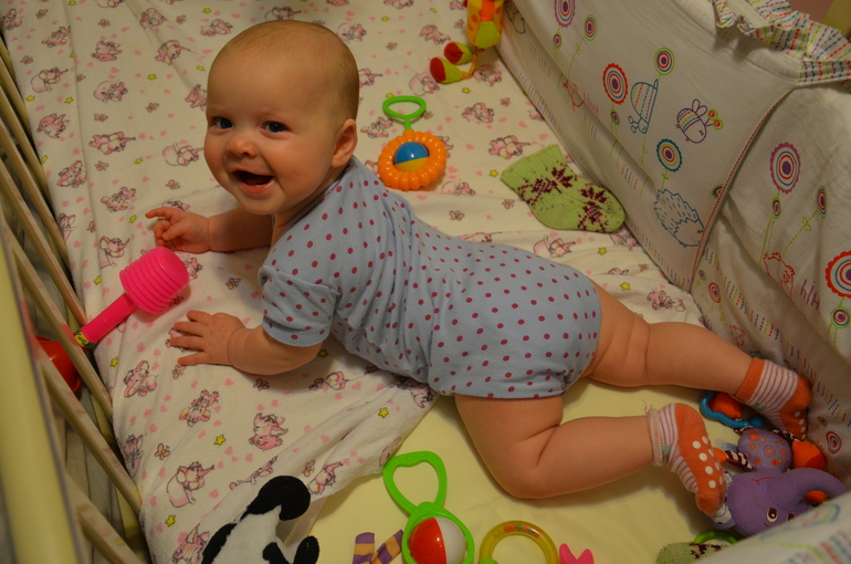 В 5,5 месяцев, на фоне ослабленного иммунитета из за прорезывания 2 нижних зубиков, заболели на несколько дней и сидели дома. В этот период научилась вставать сначала на колени, а потом и в полный рост держась руками за бортик кроватки. Потренировавшись, на 3 день, пошла по периметру кроватки. Потом в этот же день присела на корточки что бы поднять игрушку держась одной рукой за бортик. И все это за 3 дня болезни с тем-рой под 39. Обычно она просыпалась в промежутке с 3 до 6 на ночное кормление и окончательно около 10 утра, но в эти дни она вставала чуть ли неждый час, что бы тренироваться и тренироваться. Молча просыпается, встает, поковыряется там темноте, только крехтение слышно и пару раз пискнет от радости и дальше сама спать заваливается в какой нибудь неестесственной позе. Кстати, в это время полюбила окончательно и бесповоротно спать на пузике, так как днём я укладывала к себе на живот.
