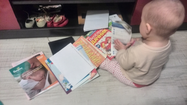 По сей день мы тренируем навыки "стоять"," ходить". Когда ползает по полу, постоянно кряхтит, важные дела открывать шкафы выгружая все на пол. Это и понятно. Все такое, ммм, вкусное. Надо повалять, погрызть, пососать какую нить тряпочку - сплошное нескончаемое удовольствие. Сначала она не доверяла полу. Он такой просторный, этот ковёр, шкафы во круг, все такое большое. Все это приводило её в ужас. На кровати она себя чувствовала всемогущей, а тут растерялась кроха. Потихоньку, через день, по 5-10 минут ползала с ней по полу. Вроде привыкла, но Лера начала лихачить. Моя вина. Она привыкла, что на кровати можно падать в любой позе когда захочется, бух и родители умиляются и самой смешно. А тут пол. Бух головой об пол... И сидим обе плачим ( в общем пару раз мы больно упали, и теперь она понимает что такое "пол"." Лера, бах, ненадо туда, потом бобо" судя по взгляду для неё это не пустой звук. Особенно этот понятно, когда она раскачивается на карачках на краю кровати, с удовольствием рассматривая, что там за красивые тапки на полу.