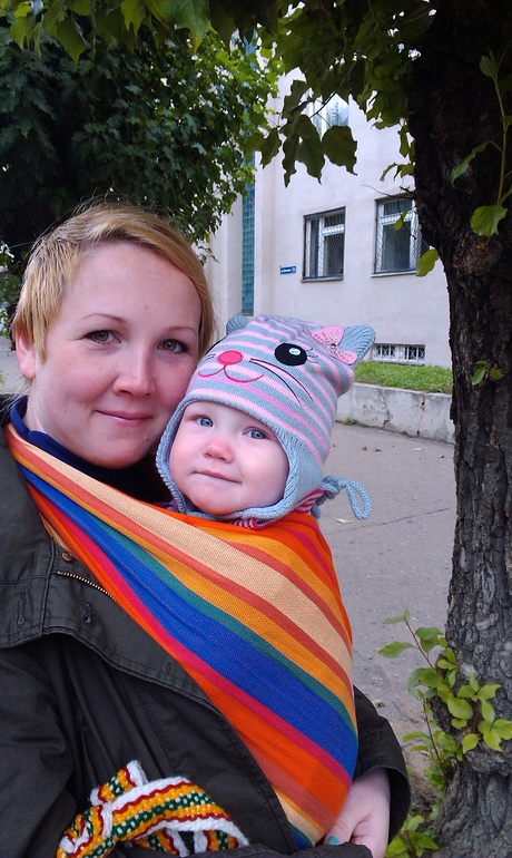 А так мы теперь ходим гулять, в слинге только на поездки, в магазин в рюкзаке поверх сажаю.