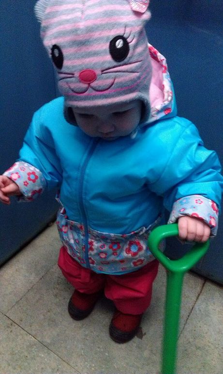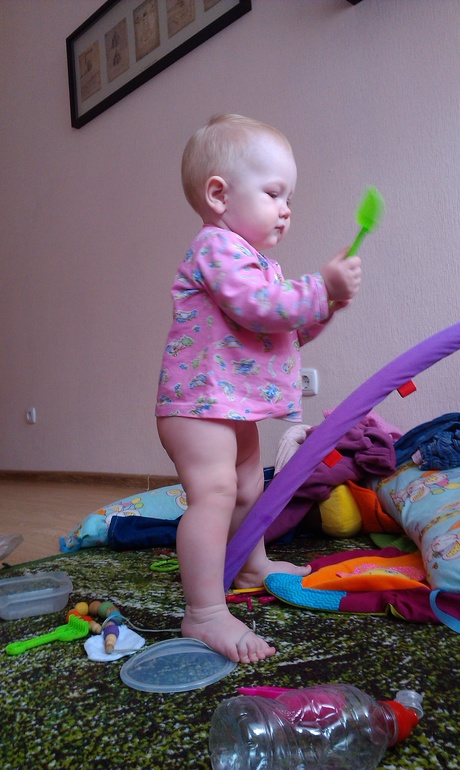 Научилась вставать без опоры с корточек, может сидеть на корточках и играть. А еще подарили нам коня, может долго около него стоять и лепетать на своём. На кухне, когда я готовлю, играет со стиралкой, с формочками для кексов, на весы садится и смотри на цифры. Если не успею закрыть ванну, заползает быстренько и хватает всё, что попадёт под руку, или под ванну) Еще нравится слушать музыкальную книгу, переворачивает странички и слушает, иногда по десять раз одну фразу) На улице всё суёт в рот, песок и камушки самое любимое.