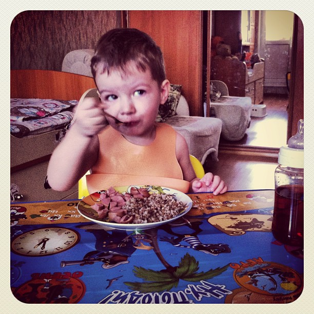 Кушает исключительно сам,никому не дает себя кормить. ттт кушает все)))