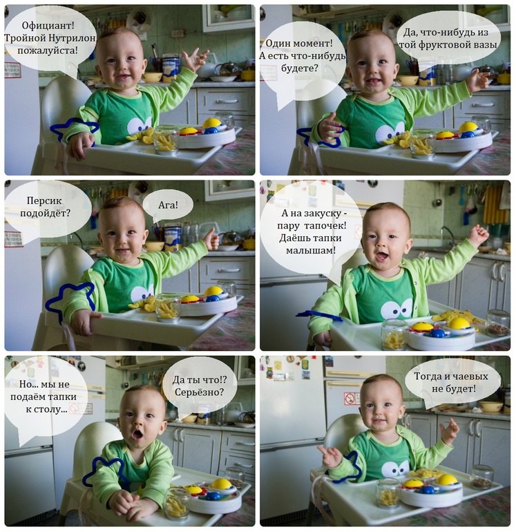 Ещё у нас появилась новая игра "повторюшки". Вначале Макс издавал какой-нибудь смешной звук: открывал и закрывал рот как рыбка со звуком "пак-пак-пак", цокал языком по нёбу или фыркал губами, а я повторяла за ним. Теперь мы чаще играем наоборот: я делаю что-нибудь из этого, периодически меняя звук, а сын радостно повторяет. Здорово отвлекает его от намерения поплакать. Когда мы изобрели эту игру, Максим был в таком восторге, что вечером вместо того, чтобы засыпать, вскакивал в кроватке и говорил мне: "Мама, мамамам, пак-пак-пак!"