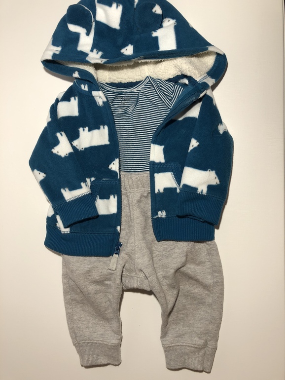 Комплект из трёх вещей (боди с коротким рукавом, штаны а-ля спорт без начоса и толстовка с утеплённым капюшоном). Размер 6 месяцев (соответствует 68 российскому). Носили мало, особенно верх так как быстро выросли. Толстовка по материалу напоминает флис. На прохладную погоду 👍