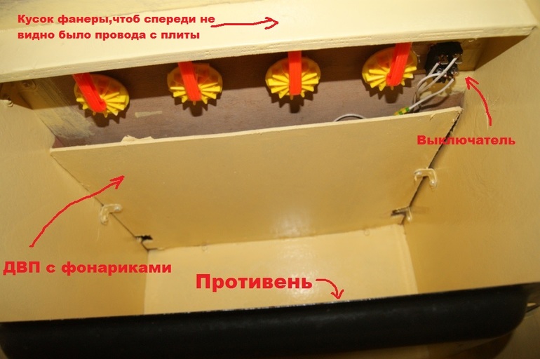 Вставляем батарейки. Прикручиваем двп с фонариками снизу столешницы. Когда нужно будет заменить батарейки, надо будет просто открутить двп аккуратно поменять батарейки всё, опять светится.=)