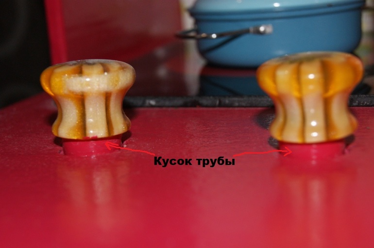 От кнопки до желтой трещотки получилось расстояние, т.к. ещё у нас есть толщина фанеры столешницы. Вот для этого и приклеили в желтой трещотке и кнопке сверху кусочек пластиковой трубки, которая из под отопления. Вот готовы трещащие поворотные кнопки.
