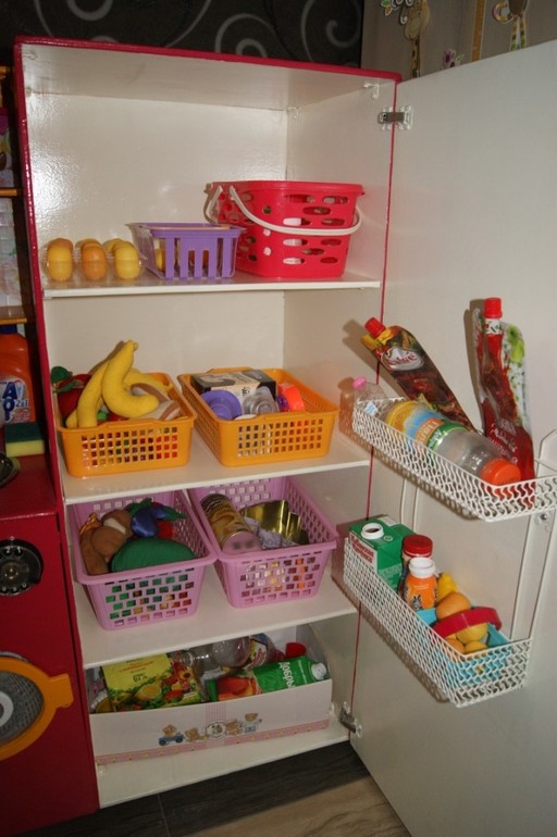 Стиралку делали почти такую же как на этом сайте http://sdelaisam.mirtesen.ru/blog/43834010843/Detskaya-kuhnya-svoimi-rukami . Вот фото внутри с открытой дверцей. Дверца прикрепляется к основанию на магните. Внутри пластиковый дуршлаг.
