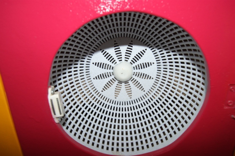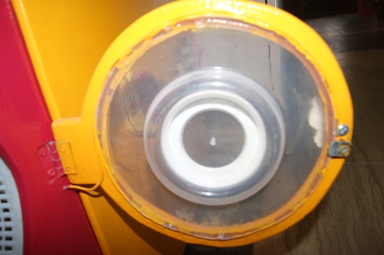 Теперь про стиральную машинку. Вот вид спереди. Справа это вставлен циферблат из старого телефона. Типо переключать режимы стирки. =) Пластик в дверце - это обрезанная крышка от какой-то пластикой посудины. Ну и сама кнопка включения стиралки. Как на варочной поверхности, только одноклавишная.