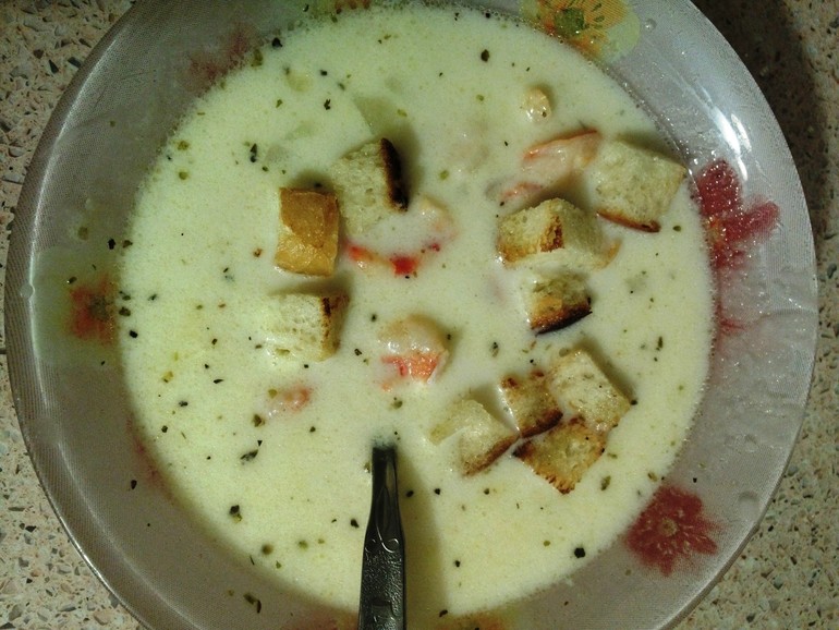 Рецепт: 1-1.5 литровую кастрюльку воды поставить на огонь, добавить 1 лавровый листик, щепотку смеси прованских трав, мускатный орех молотый. Туда же покрошить большую картофелину. Половинку луковицы мелко нарезать и поджарить на оливковом масле. Нарезать кубиками плавленный сырок "Дружба" с луком. Все это варить 15 минут, посолить, можно добавить сахарку. Креветки сырые тигровые очистить, порезать пополам и поджарить до покраснения, добавить в суп и варить еще 5 минут, снять с огня, добавить кусочек сливочного масла.
