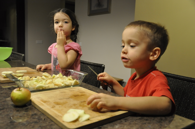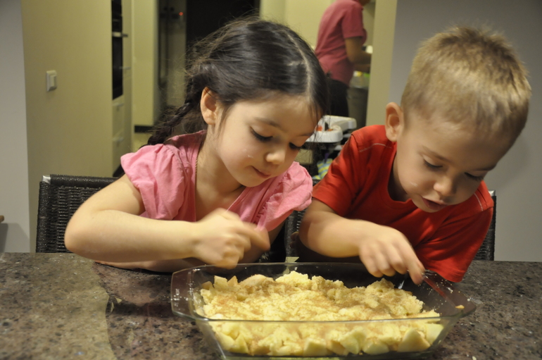И разумеется мои юные поварята не смогли пройти мимо Яблочного крамбла из рыжей книги осени, который мы приготовили в тот же вечер. Рецепт оказался настолько простым, что мои четырехлетки запросто с ним справились самостоятельно.