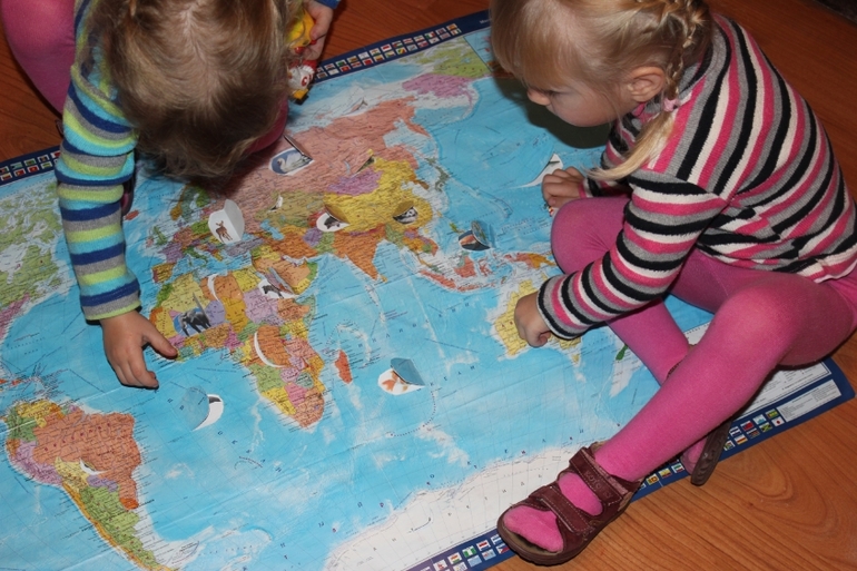 Очень понравилась карта! Все открывали и открывали окошки))) Папа за кадром, сидя на диване рассказывал про моря-океаны, материки, зверей-насекомых)))