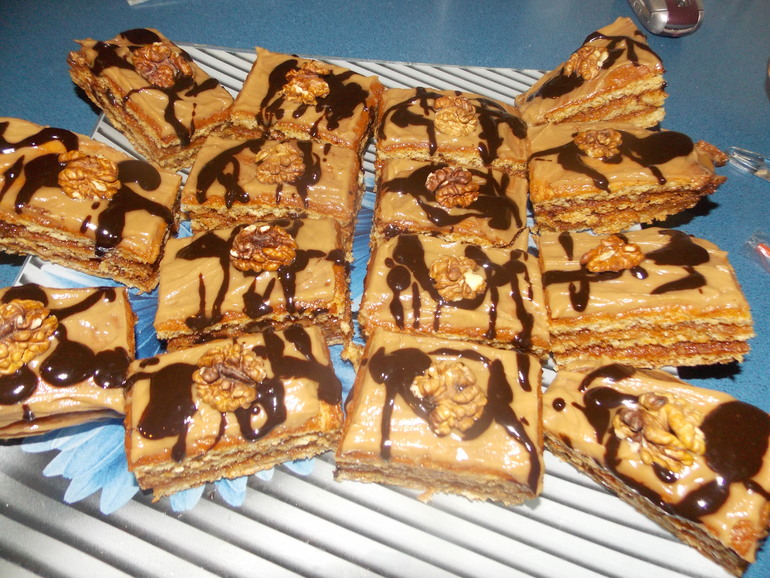 Для теста: 4 яйца, 2 стакана сахара, 4 ст.л. меда (лучше темного), 1,5 ч.л. соды, гашенной уксусом, 2-2,5 ст. муки, 1 стакан жареных орехов, рубленных ножом, лучше арахис (я делала без орехов, я их не люблю)