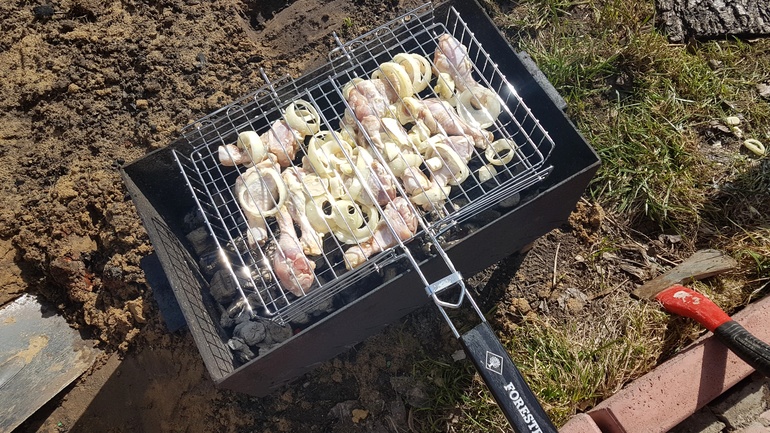 В эти выходные мясом был шашлычок, приготовленный на свежем воздухе. Сегодня вечером то ж будет. Уже замариновала. Опробую новый мангал!