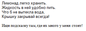 Ответ - бутылки. Весь лимонад стоит у меня на одной полке, найти было легко! Сейчас каникулы, но про школу не забываем. Следующее задание - математическое: