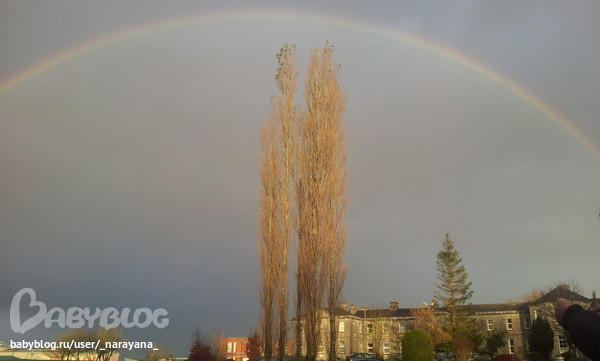 с широкоформатным объективом... Такая красотень была, когда мы возвращались из магазина.... Показываю то что влезло на мобильник. Там сверху была ещё вторая радуга... Но к сожалению дальше я уже не смогла отойти что бы захватить весь объём :(