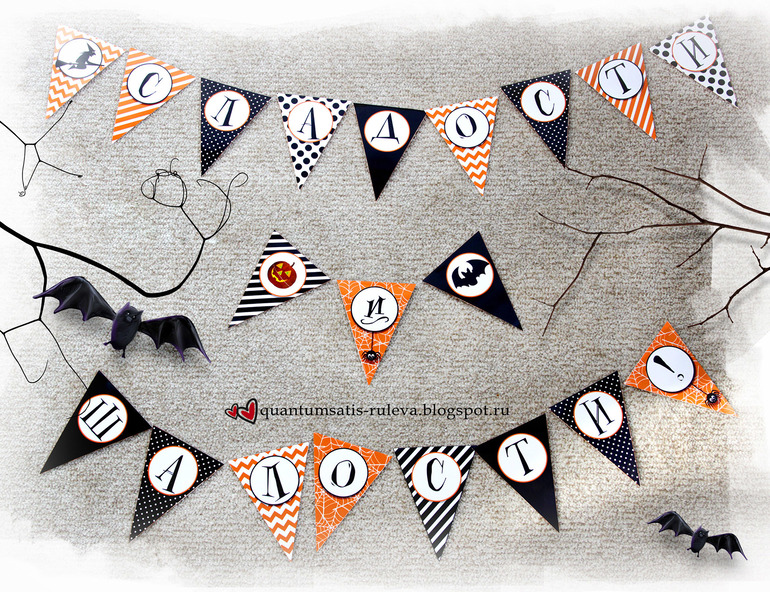 Уже без помощников я сделала гирлянду "Сладости И Шалости", именно "И", потому что у нас будет так. Никаких "ИЛИ", хотим всё и сразу!)