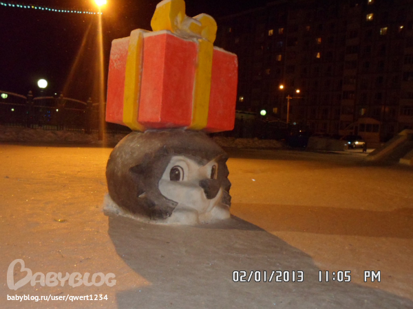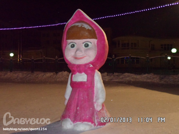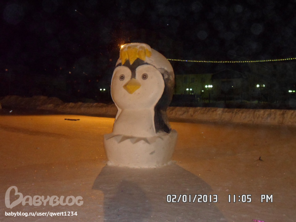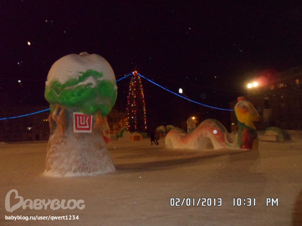 А это другой район - и своя елка и скульптуры из снега. Змея, мне кажется, больше на гусеницу похожа.