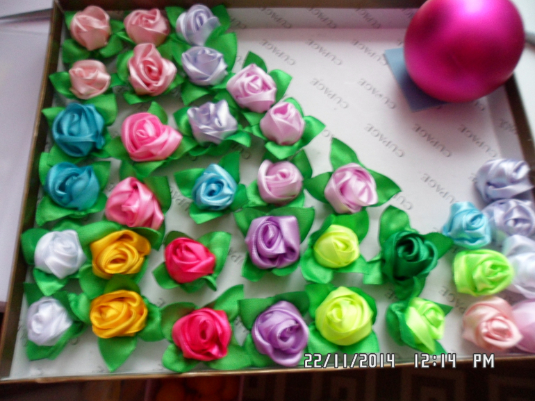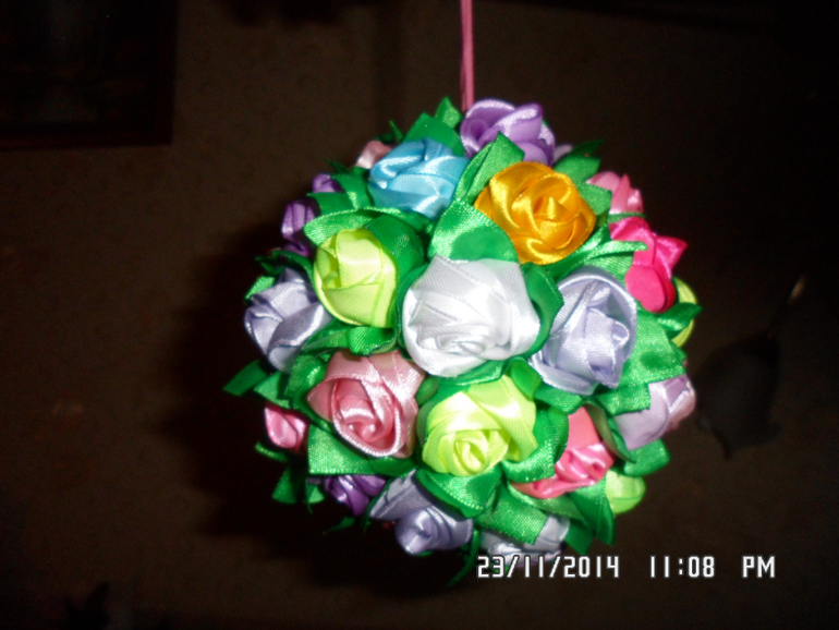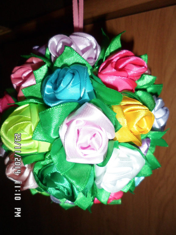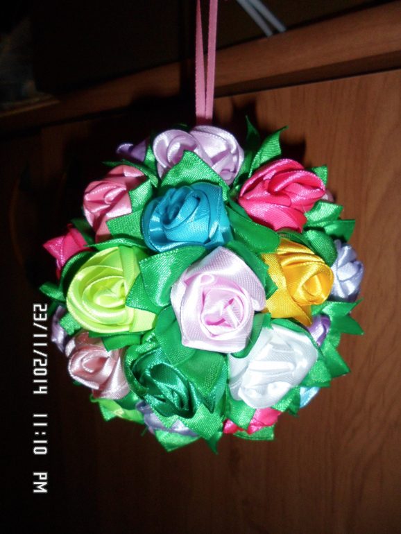 Увидела я на просторах инета такой букет-шар из маленьких розочек, сделанных из атласных лент и захотелось мне сотворить что-то подобное. Спасибо автору Наталье :
