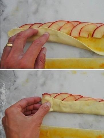 Раскатываем тесто, нарезаем полосками, смазываем джемом, раскладываем яблоки, можно присыпать корицей. И скручиваем.