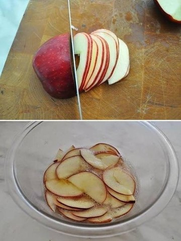 Яблоки смешать с соком лимона и водой и нагреть в микроволновке на 3 мин.