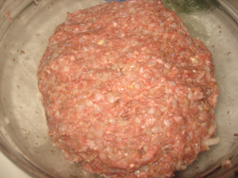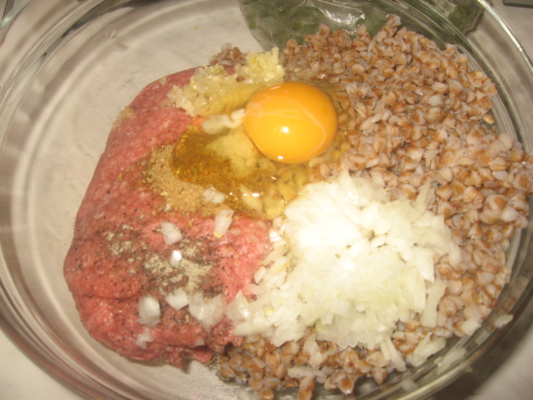 Смешать фарш, гречку, специи, соль, яйцо, мелко-рубленный лук и пропущенный через пресс чеснок.