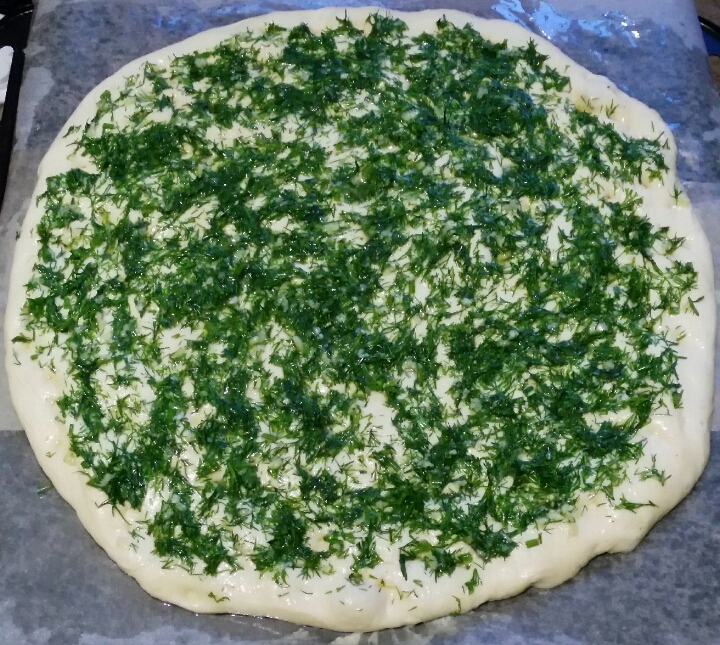 Противень смазать растительным маслом (можно выпекать на бумаге), из подошедшего теста на противне сформировать лепешку диаметром приблизительно 30 см, толщиной не более 1 см. Смазать поверхность фокаччи маслом с чесноком и укропчиком, посыпать крупной солью.