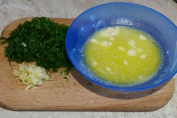 Сливочное масло растопить и смешать его с чесноком и укропом.