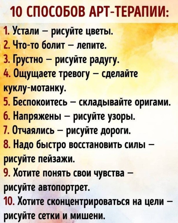 Мария К. 6 лет Арт-терапия. Прочитала в интернете про арт-терапию. Скопировала вот такую открытку-памятку, может пригодиться кому. Посмотрите еще 20 записей на эту тему Отменить Ответить Привет! Мысли вслух Чаты Беременных Выберите чат: Январята-2026 Февралята-2026 Мартята-2026 Апрелята-2026 Майчата-2026 Июнята-2026 Июлята-2026 Августята-2026