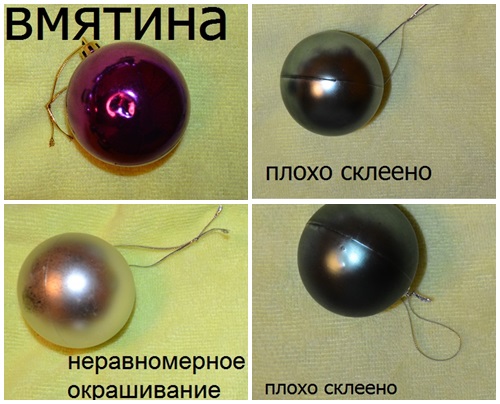 Покупались за значительно бОльшую цену, но пришли все с браком, веду переговоры с магазином. Брак есть в виде царапин, вмятин, отошедшей краски, неаккуратно склеенных половин. На елке среди веток и мишуры заметно не будет. Если нужно - могу сделать фото конкретного набора чтобы было видно все недочеты.