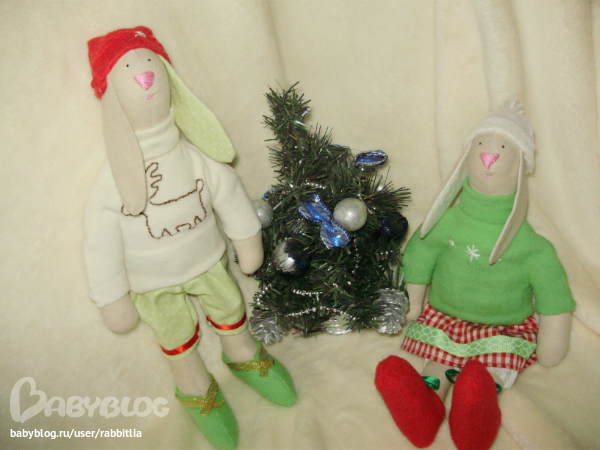 Представляю вашему вниманию пару новогодних заек, сшитых по мотивам "Тильда"! Рост 30 см. Самостоятельно стоят и сидят, благодаря проволке в ногах
