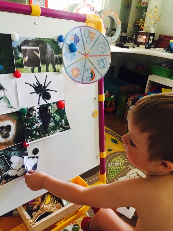 Далее повстречали летучую мышь, как ни странно, но этот персонаж нравится Митюшке больше всего, даже в зоопарке он впервую очередь решил найти именно ее. Мышка задала нам задание: нужно маленькие картинки - части прикрепить к нужному животному
