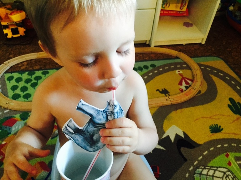 рассмотрели его, нашли бивни, хобот, ушки. Сделали трубочку-слона, пускали пузыри и просто Митя пил из нее еще неделю