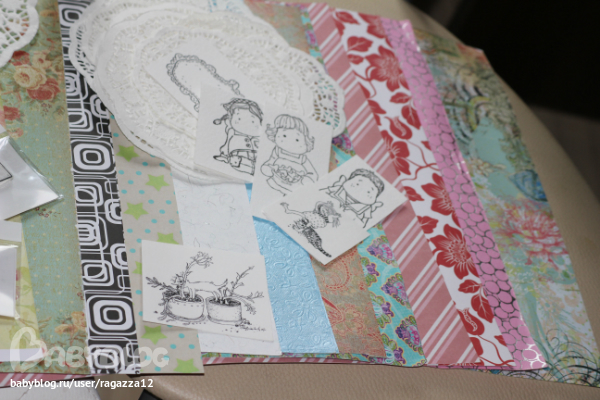 Со всякой скрап-красотой:)Это я участвовала в игре "Исполнение желаний".В посылочке бумажечка для скрапа,штампики.Очень красивые надыроколенные ярлычки и отштампованные девочки и...не девочки:).Еще салфеточки,цветочки,листики...Для сынки мягенькие носочки,а для дочки резиночки.Соррриии,но Настенка резиночки одела в школу,хотя я и попросила подождать до фотоотчета.Эх...девочка -подросток,не может удержаться ,любит пофарсить:)