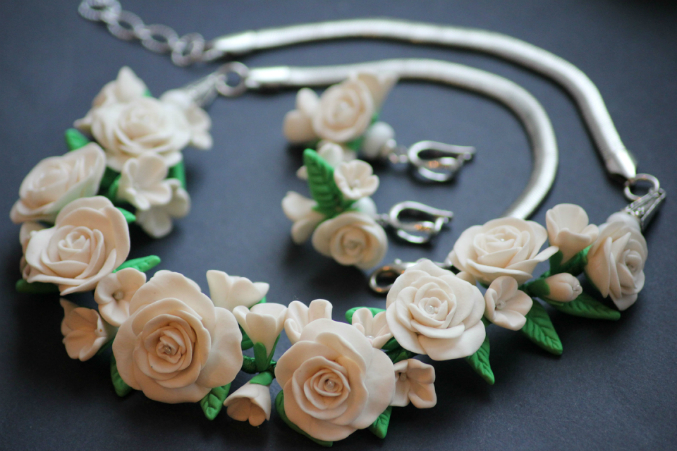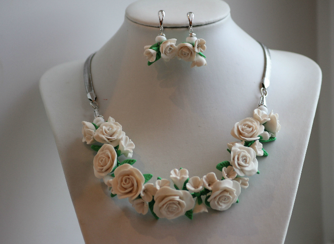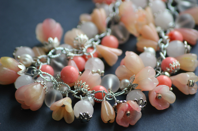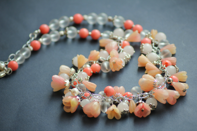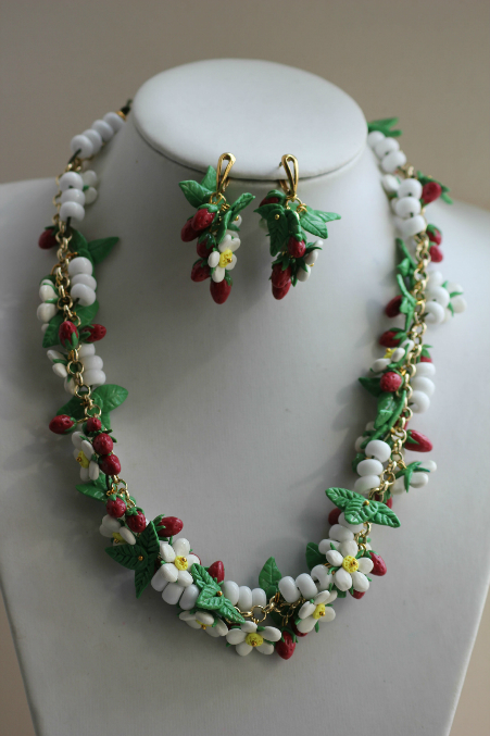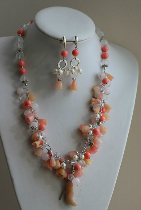 Колье и серьги из коралла,полимерной глины фимы,розового кварца,агата и жемчуга.Туфелька отстегивается и становится брелочком.