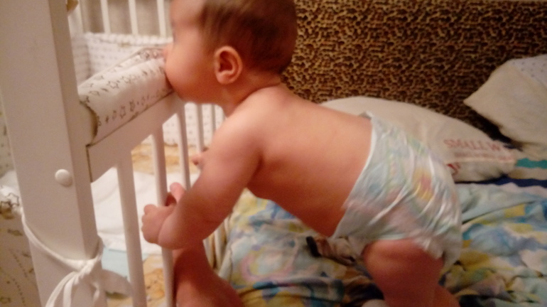 Во-первых, он научился ползать, хоть и медленно, а еще вставать у опоры. Теперь передвигается по дому, доползает до какой-нибудь цели и начинает вставать. Иногда у него разъезжаются ноги и тогда он вопит. Завтра будем зан...