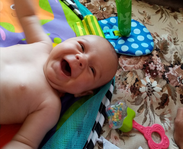 А моя только улыбается да пищит))) и пару раз во сне в голос смеялась)) никак все))