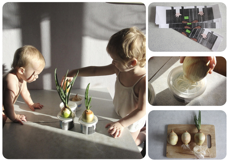 Наша бабуля заботливо подготовила для нас несколько головок лука, у двух луковиц даже отросли перышки! Но есть и без корешков, так что наблюдаем в динамике как растет лук.