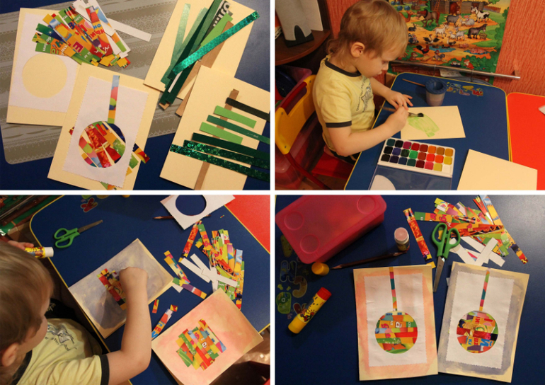 Первое, собранное на скорую руку: коробка с елочными игрушками и старым запутанным дождиком. С игрушками весло бегать по квартире и даже украшать. А в дождике можно прятать игрушки и запутывать пальчики.