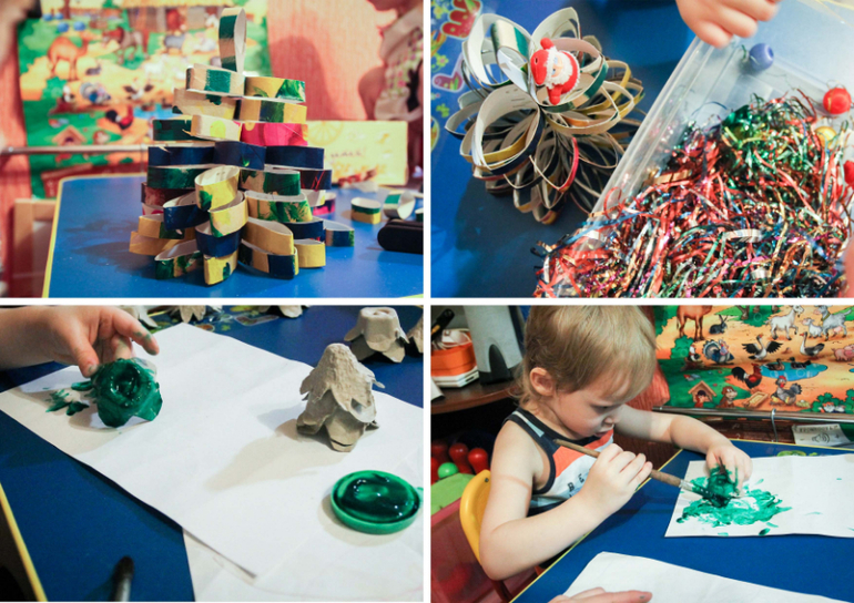 И вот, наш папа отправился на улицу добывать снег, а мы разогрели аппетиты и смастерили пару елочек "из ничего".