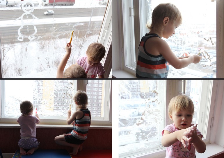Во-первых, мы всегда рады измазаться чем-нибудь, а потому окна было решено украшать зубной пастой. Дети не ожидали от мамы такой щедрости, потому сначала с опаской держали тюбик с зубной пастой, но когда поняли, что мама не шутит - разошли на полную)))
