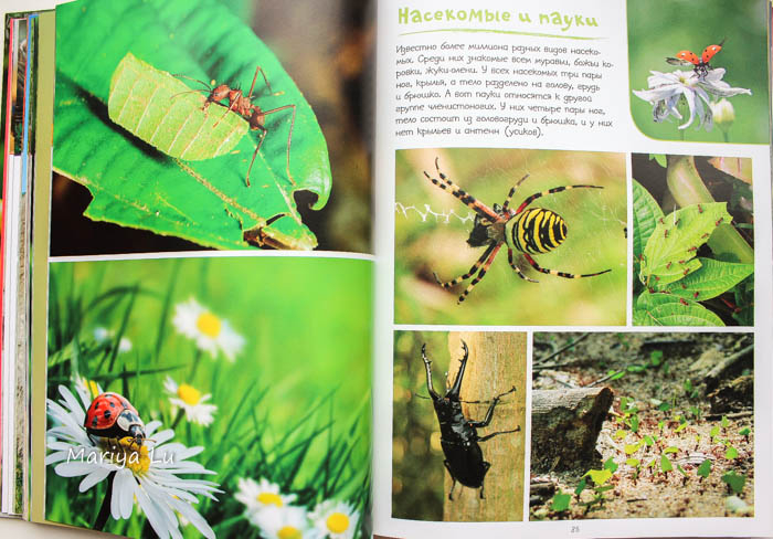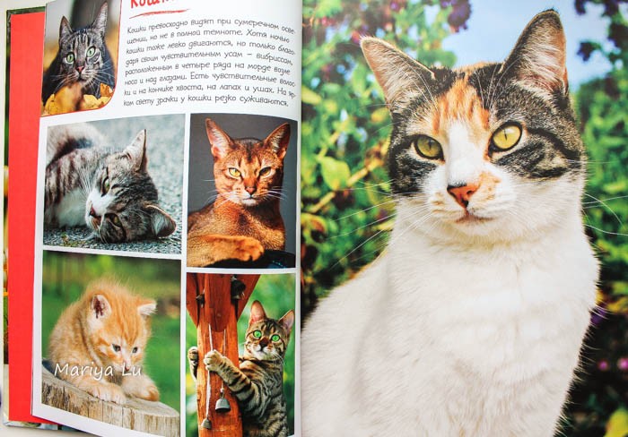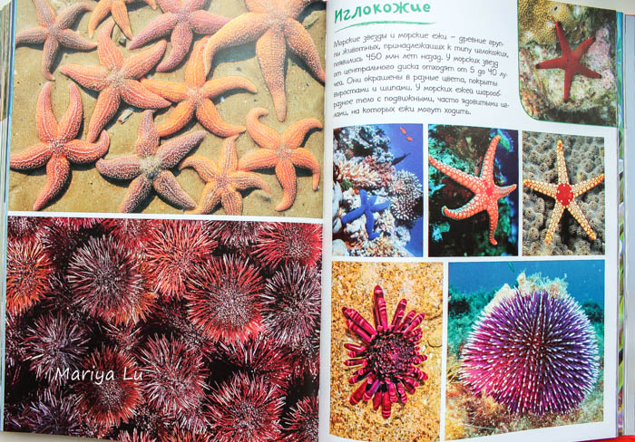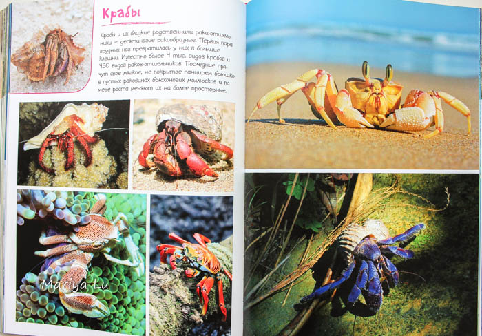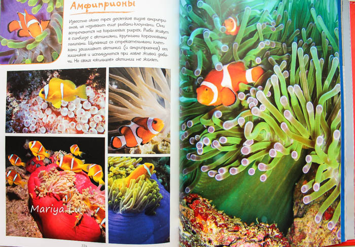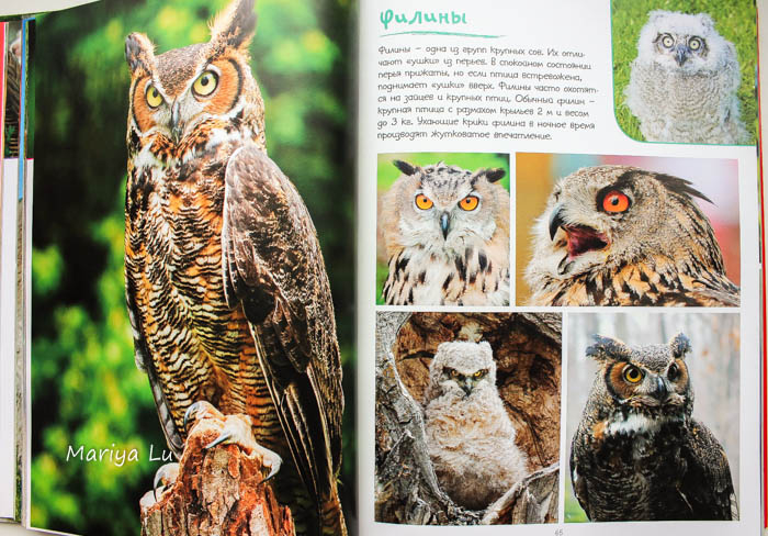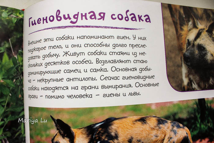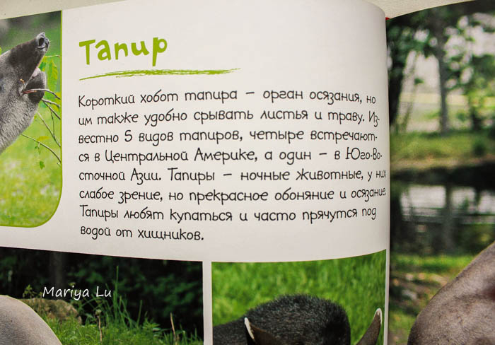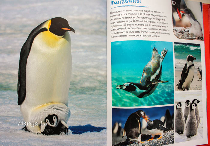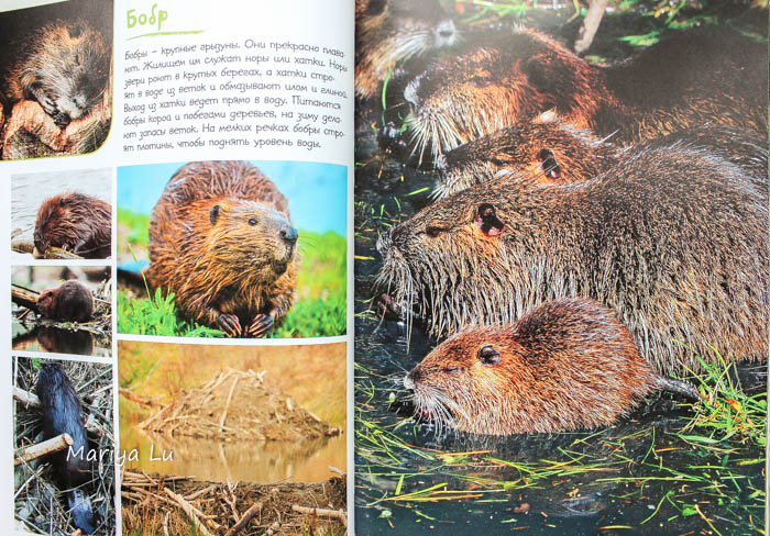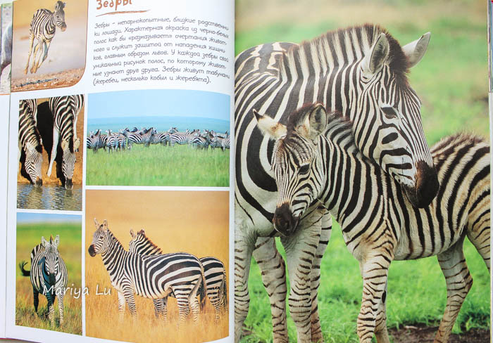 На одном развороте не обязательно один вид животных, бывает несколько,но относящихся к одному семейству. Лично мне не хватает подписей к некоторым фото,т.к. если скунса и барсука легко идентифицировать,то с птицами леса или коралловыми рыбками случаются промахи. Часто на помощь мне приходит Животные мира. Полная энциклопедия на карточках ( обзор) ,ее могу посоветовать для деток постарше.