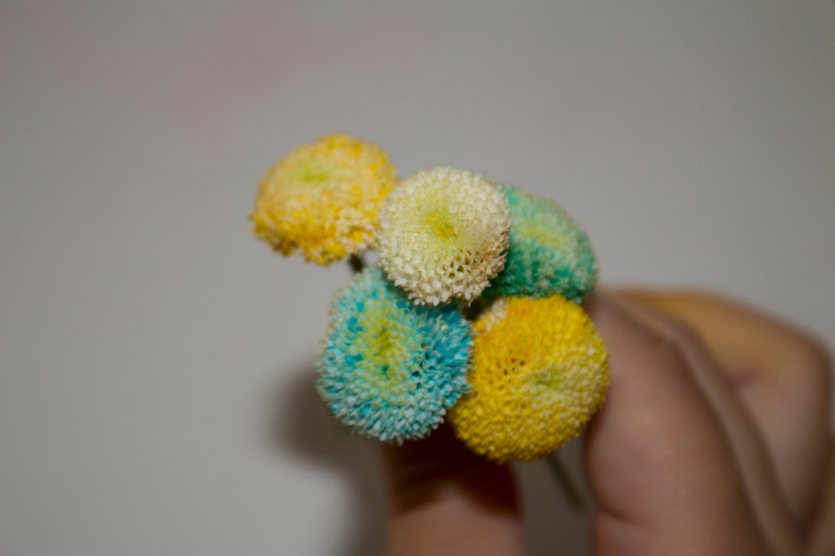 3. Красили цветочки. Вытащили белые цветочки из букета, поставили в крашеную воду и наблюдали за чудом) Оранжевый и красный - стали почему-то желтыми, а вот синий и зеленый получились хорошо. Говорят еще здорово такой опыт с хризантемами проводить - очень нежные цвета получаются.
